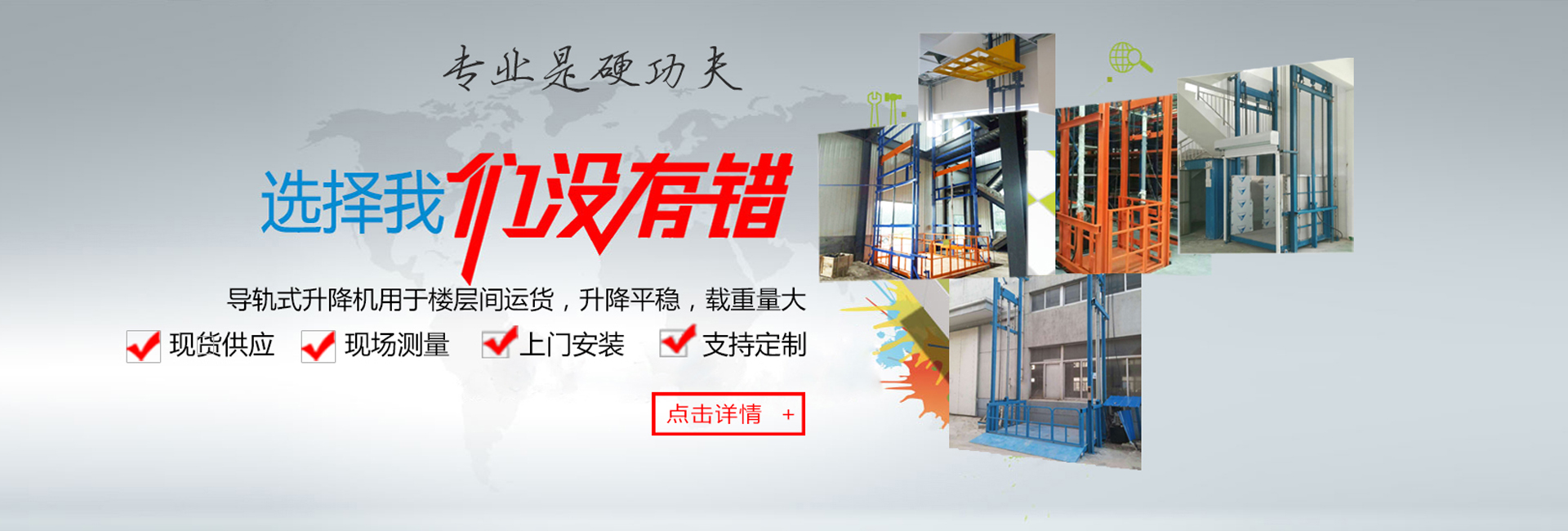 濟(jì)南強(qiáng)森升降機(jī)械有限公司是專業(yè)的液壓貨梯專業(yè)生產(chǎn)廠家, 主導(dǎo)產(chǎn)品為:SJY系列貨梯、固定式液壓升降貨梯、導(dǎo)軌式貨梯、導(dǎo)軌式升降機(jī)、登車橋、移動(dòng)式升降機(jī)、大噸位貨梯等各種特殊產(chǎn)品,廣泛用于建筑內(nèi)外裝修、車間、車站、商店、大廳、路燈、物流裝卸、工業(yè)流水線、高速公路等各行各業(yè)。售后服務(wù)鄭重承諾:·公司承諾設(shè)備免費(fèi)保修期一年,終身維護(hù)。設(shè)備保修期過后,只收取零部件及維修成本費(fèi)·設(shè)備到現(xiàn)場(chǎng)后,由經(jīng)驗(yàn)豐富的專業(yè)技術(shù)人員對(duì)設(shè)備進(jìn)行免費(fèi)調(diào)試并負(fù)責(zé)培訓(xùn)設(shè)...
